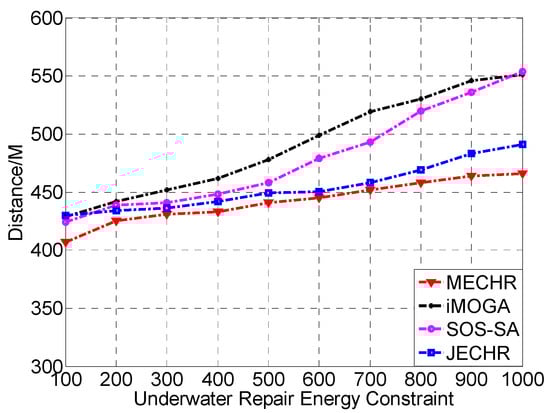 The MECHR algorithm made a comparison with the iMOGA, SOS-SA, and JECHR algorithms in terms of repair route distance under different underwater repair energy constraints.
