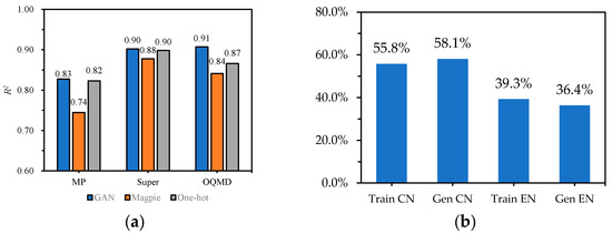 (a) Comparison results of R2 on the three data sets MP, SuperCond, and OQMD. (b) the percentages of charge-neutral (CN) and electronegativity balance (EN) samples generated from OQMD dataset are very close to those of training set.