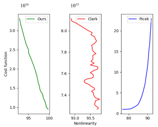 The curve representing the trajectory of Clark’s cost function (Figure 1—red) and the corresponding correlation in Table 3 may be helpful to give some explanation of the late convergence of Clark’s cost function in [17,24]. Although there is some improvement in the final nonlinearity, one can easily see in the plot that there is no stability in the trajectory. In accordance, the correlation coefficient describes very well this phenomenon. The correlation coefficient indicates an inverse relation between Clark’s cost function and nonlinearity, but not enough to ensure a fast convergence of nonlinearity to higher values as the value of Clark’s cost function decreases, which agrees with the results obtained by Tesař [17] and Picek et al. [24].