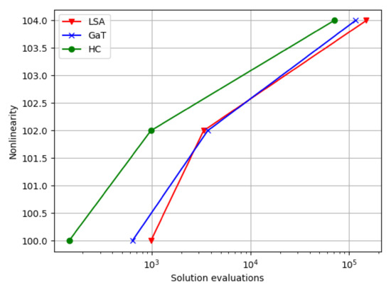 We execute different amounts of experiments according to dimensions of the analyzed s-box space. The stopping condition for each algorithm is reached when a fixed number of solution evaluations are done, which differ in relation to the size of the space as shown in Table 1. In all algorithms used, we define the fitness function as the tuple . Here, represents the nonlinearity of the solution and represents the value of our new cost function. We decide not to include small s-boxes since the best value of nonlinearity can be achieved without the assistance of optimization algorithms. However, for larger sizes, s-boxes having maximal nonlinearity are quite difficult to found by any evolutionary algorithm when it starts from random n-bit permutations. Thus, our goal is to increase nonlinearity of evolved s-boxes as much as possible.