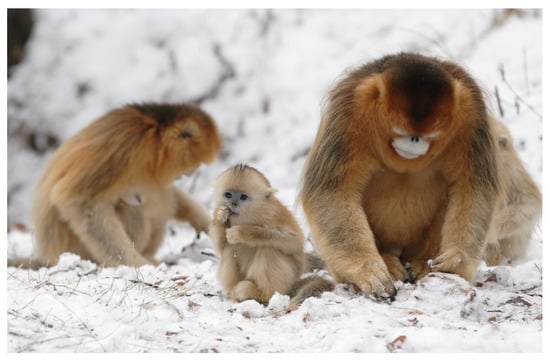 - Zhang, P.; Watanabe, K.; Li, B.G.; Tan, C.L. Social organization of Sichuan snub-nosed monkeys (Rhinopithecus roxellana) in the Qinling Mountains, Central China. Primates 2006, 47, 374–382. [Google Scholar] [CrossRef]