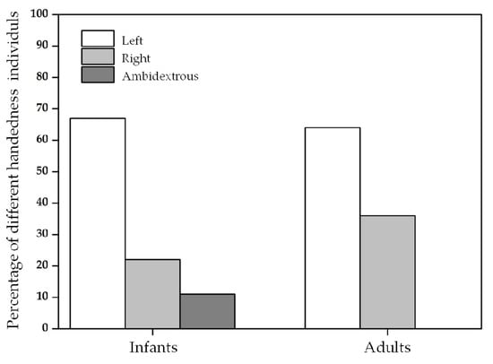 Compared with infants, adults showed stronger handedness in the present study. Hopkins and Bard in their early study mentioned a positive correlation between the strength of hand preference and age [] and the view was supported by other studies in nonhuman primates. For example, adult capuchins (mean age per subject: 12.1) also expressed a stronger hand preference than did immature individuals (mean age per subject: 1.4) []. Likewise, the degree of laterality increased with age in bonnett macaques before 14 months []. The result is also quite similar to these obtained in humans [].