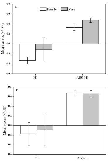 Sex differences on the direction and strength of hand preference in R. roxellana based on HI scores and ABS-HI scores, respectively. (A) Sex differences in adult individuals. (B) Sex differences in infant individuals. There were no significant sex differences both in adult and infant R. roxellan. ABS-HI, the absolute value of HI.