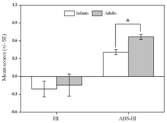 Comparison between adults and infants in the direction and strength of hand preference in R. roxellana based on HI scores and ABS-HI scores, respectively. * represented a significant difference between adults and infants in the strength of hand preference (p ≤ 0.05).