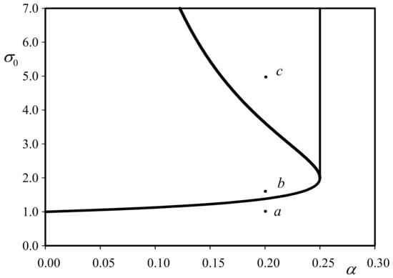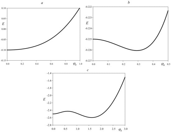 The phase diagram, indicating the regions of the existence of energy minima (23), is shown in Figure 2. Region a in the phase diagram corresponds to the existence of only one minimum . In region b more minima appear, but in region c all possible solutions (23) are realized. The corresponding points on the phase diagram denote the sets of parameters for which the energy of the system was plotted for each of the regions (see Figure 3).