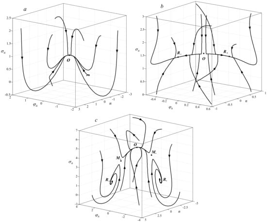 The corresponding phase portraits are shown in Figure 4. As can be seen from Figure 4a, with such a set of parameters, only a disordered state is realized, i.e., no relaxation zones are formed. In this case, the type of stability of a single point O corresponds to a stable node. In Figure 4b point O turns into a saddle, but at the same time, two stable nodes appear. They characterize an ordered state, i.e., processes of formation of relaxation zones on the surface of the material. Figure 4c describes a more specific regime where three points O, become stable, but two saddles separate them. That is, such a case is characterized by a situation of coexistence of two states (ordered and disordered). In addition, as can be seen from the figure (points are stable focuses), the processes of formation of relaxation zones on the surface of the material are of an oscillatory nature.