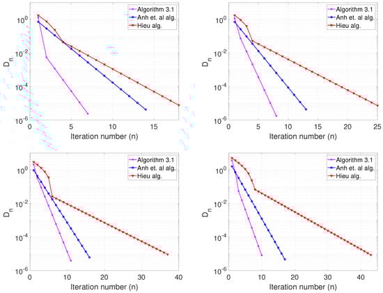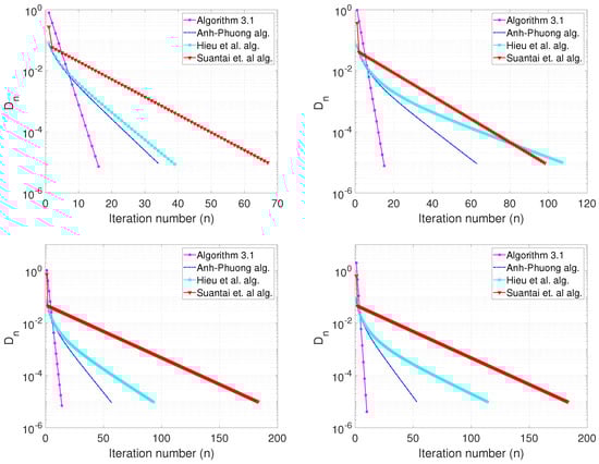 such that for each , is a matrix, is a skew symmetric matrix, is a diagonal matrix, whose diagonal entries are non-negative (so is positive definite) and is a vector in . The feasible set C is given by , where is generated randomly and c is a positive real number randomly in . It is clear that for each i, is monotone (hence, pseudomonotone) and Lipschitz continuous with Lipschitz constant . The entries of matrices are generated randomly and uniformly in , diagonal entries of are in and is equal to the zero vector. In this case, it is easy to see that the . For , let be defined by , for . Then is 0-demicontractive mapping, and is demiclosed at 0. Also for , let , (I being the identity operator on H), we choose , , , , for all . We compare Algorithm 3 with Algorithm 1 of Anh and Phuong [], Algorithm 2 of Hieu [], and Algorithm 1 of Suantai et al. []. We test the algorithms using the following parameters.