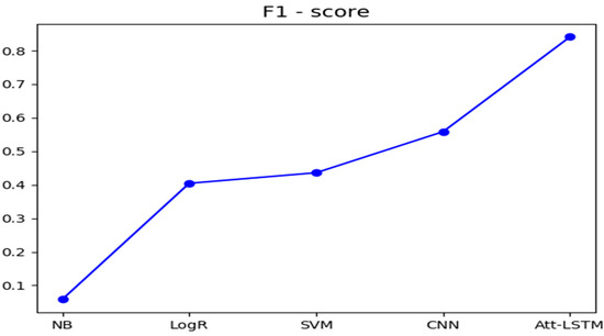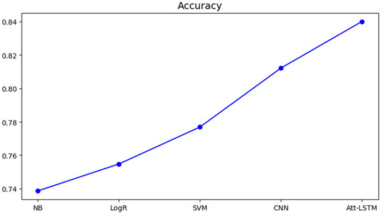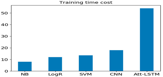 Training stage: as shown in Figure 2, NB, LogR, and SVM were trained fast. In particular, NB run the fastest among the compared algorithms. LogR and SVM cost little more time than NB, but they saved a lot of time than neural networks. The attention-based LSTM took much time than the other four algorithms.