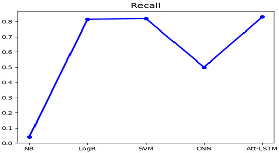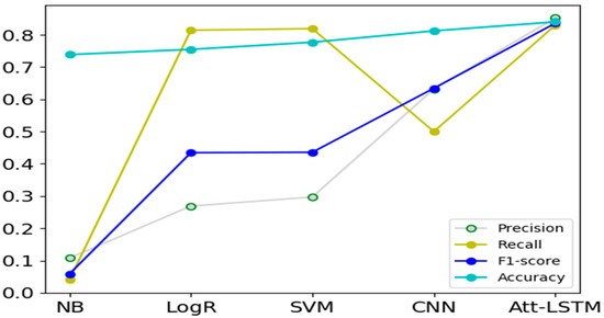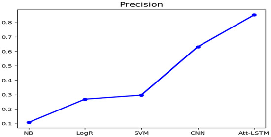 Precision: the precision metric measures the capabilities of the models in the positive prediction. As shown in Figure 3, for the student comment dataset, deep learning approaches performed better than the traditional machine learning algorithm. Att-LSTM performed best, with its precision of up to 85.23%, while NB had 10.76%. The linear models, LogR, and SVM achieved similar scores in precision. Note that these models were trained by using the same feature selection method.