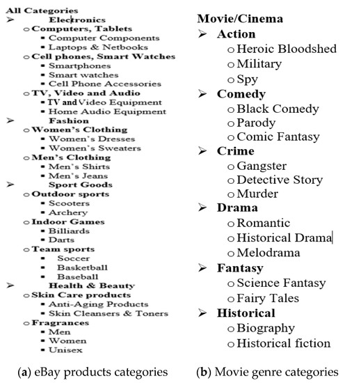 One of the most significant challenges for recommendation systems is to elicit valuable information from the features of highly correlated users and items in a user–item interaction that forms the basis of the prediction process. Typically, this is modeled using the flat attributes of users (for example, gender and age) or items (in the case of a movie, this can include an actor, a producer, release date, language, and country). However, these features may often be represented in a multilevel structure, i.e., a hierarchy, in the form of a tree with nested nodes (for example, movie genres and user occupations). Simple representations of a hierarchical structure include movie genres and product categories on e-commerce websites, as shown in Figure 1.