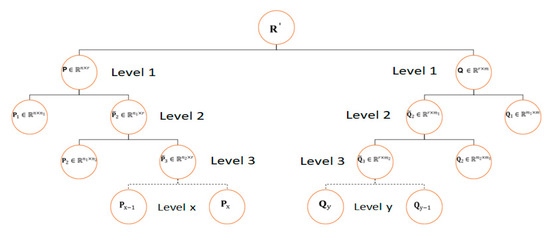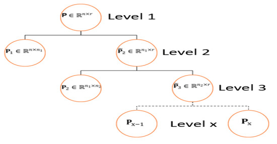 where is the number of users, is the number of latent categories (space) in the first hierarchical level, and and is the number of subcategories in the second hierarchical level. Thus, is the relationship of users to subcategories. denotes the second level of the hierarchical structure of users obtained from the relationship between the number of latent categories (space) in the first hierarchical level and i.e., the number of latent subcategories in the second hierarchical level. To compute the third level of a hierarchical structure of users, as given in Equation (4), is further factorized as and :