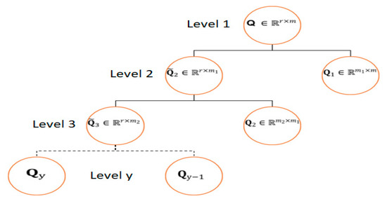where is the number of subcategories in the third hierarchical level. Therefore, deep factorization on serves to obtain the th level of the hierarchical structure of users, , which is accomplished by factorizing , the latent category relationship matrix of the th level of the hierarchical structure, into non-negative matrices, as follows: