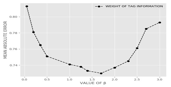 The extra regularization parameter, , controls the contribution of tag information in learning the item latent feature vector. In other words, for , our methodology adopted the basic WNMF to compute Equation (13) and thereafter predict ratings, whereas, for non-zero values, the weight of the tag information manifested its effects on the predictions, as illustrated in Figure 5. Although this reflects a certain degree of reliance on for the proposed approach, it also proved the efficiency of using a combination of hierarchical and tag information. The correlation between MAE and for in the range of 0.05–3.0 was plotted for the 80% training dataset and the accuracy increased proportionally with , peaking between 1.0 and 2.1 (lowest MAE recorded).