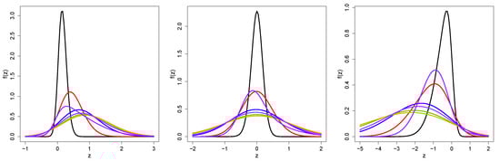 where the quantile is assumed to be known. Hereafter, we use the notation to indicate that Y is a random variable following a restricted PSN distribution with quantile parameter , precision parameter , and shape parameter . Figure 1 shows the density function for the RPSN model with location and scale parameters fixed at 0 and 1, respectively. Note that in all the curves, the zero represents the specified quantile . We also note that the curves are not necessarily symmetric for (the median case).