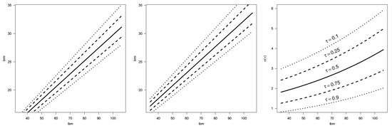 Table 2 displays the MLEs with corresponding standard errors (SE) for the fitted proposed model for each and . Note that we have a positive relationship between the response variable (bmi) and lbm in all quantiles. We also observe that the quantile intercepts increases as increases. Regarding the parameter , the greater , the greater the estimate of .