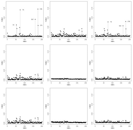 Index plots for (left), (center) and (right) under the weight perturbation (upper), response perturbation (center) and covariate perturbation (lower) schemes for RPSN model for .