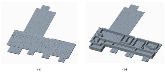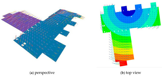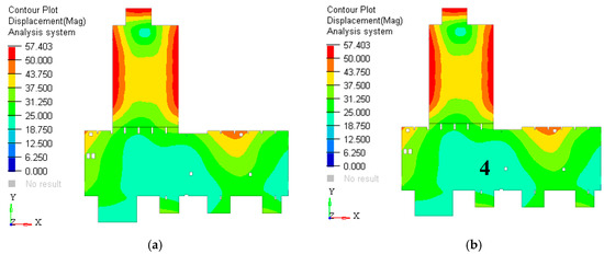 Comparison between the deformations of the standard plate and the deformations after removing a 250 tons wall: (a) deformation field for the initial platform and (b) deformation field if a wall is removed. There are no significant differences between in the two cases.