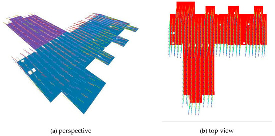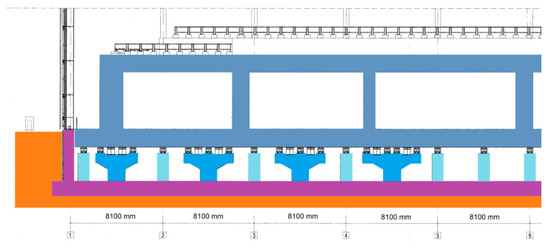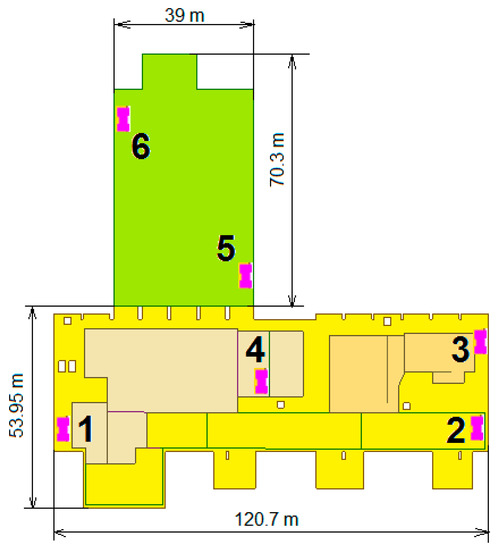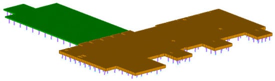 The insulation platform consists of a solid concrete block, made up of two parts, i.e., one of them (which we call the main part) having a thickness of 1600 mm and the other (which we call secondary) having 600 mm. At the dimensions of the construction and at the masses to be placed on top, the deformability of the platform becomes important for obtaining precise (accurate) experiments. For this reason, it is necessary to study the deformability of the concrete platform both under the action of its own weight and as a result of additional loads. The spring suspensions of the platform must be distributed as evenly as possible, and thus, a support system has been designed on about 1000 spring batteries. The inactive elements in the spring batteries can be activated in case of need and can rebalance portions of the platform, leveling its deformations and the tensions that appear in it. Each battery consists of 3–7 springs, and between the springs are located vibration dampers. The springs can be operated (i.e., support the platform) or are not in service, do not support the platform at this time, but can be released and become active, if necessary. Thus, a study was made of the stresses and deformability of the platform placed on the spring batteries, without additional masses placed on top. The finite element method was used to determine the stress and stress that occurs in the platform block. Figure 4 shows the set of two blocks consisting of the main body (shown in yellow, 1600 mm thick) and the secondary body (shown in green, 600 mm thick). The positions where 1000 tons of loads will be applied successively are shown in purple. We put in a limited area, equivalent with the basic surface of a wall (approx. 20 m2), the considered supplementary mass.