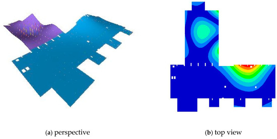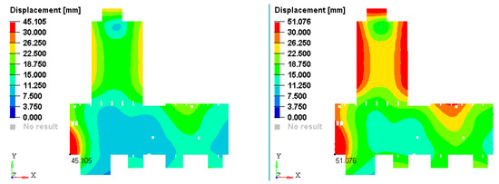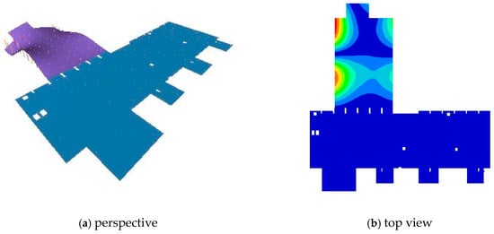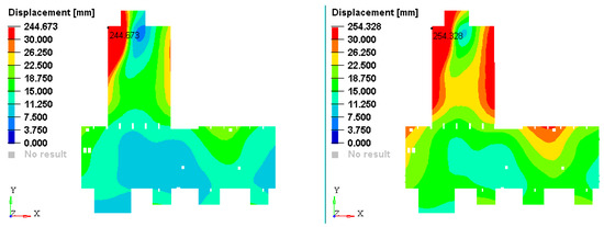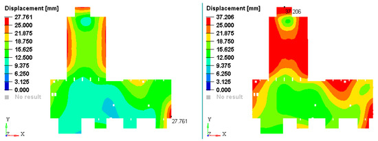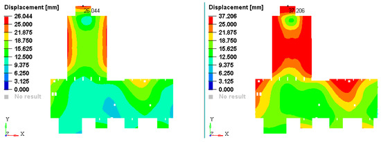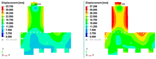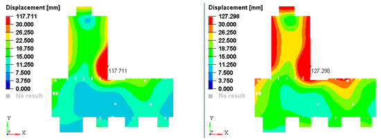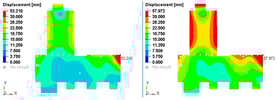 In Figure 5, Figure 6, Figure 7, Figure 8, Figure 9, Figure 10, and Figure 11, two cases are presented in parallel: the case of the unloaded platform (total mass 25,000 tons) and the case of the platform with vertically mounted walls (total mass 35,000 tons). The deformation of the concrete platform loaded with its own weight; placed on the spring batteries, is presented in Figure 5, i.e., on the left is the 25,000 ton variant, while on the right is the 35,000 ton variant. Figure 6 shows the deformability of the platform if the load of 1000 tons is applied in point 1. A logarithmic scale is used for a better visualization of the deformation situation. In Appendix A, the deformations using a linear scale are represented (Figure A1, Figure A2, Figure A3 and Figure A4).