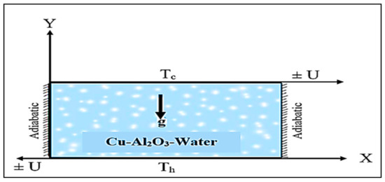 Figure 1 illustrates the 2D steady mixed convective heat transfer in a rectangular cavity of length (L). The bottom and top movable horizontal walls are isothermal with and respectively (). The side walls are insulated. The liquid in the cavity is the water-based nanofluid containing both Al2O3 and Cu nanoparticles. The mathematical models governing the mixed convection can be written as: