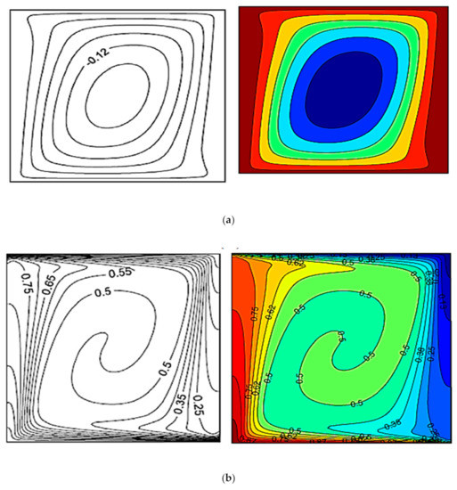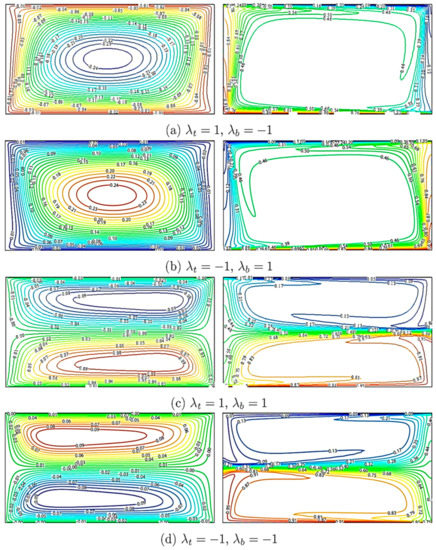 As shown in Figure 6 (case 1) where the bottom and upper walls slide to the right and left respectively, a clockwise rotational flow path is expected (see Figure 6a). Figure 6 (case 2) shows that when the bottom and upper walls slide to the left and right respectively, a counterclockwise flow rotation can be triggered (see Figure 6b). As a result, the warm liquid ascends along the right wall and arrives at the upper wall, whilst the cold liquid descends along the left wall (opposite to Figure 6a). Therefore, it can be seen that isothermal lines of higher temperature can be spotted nearby the right wall while lower temperatureisothermal linesemerges nearby the left and upper walls. In Figure 6 (case 3), both horizontal walls slide to the right, causing clockwise and counterclockwise circulations (Figure 6c). Lower fluid layers circulate in the counterclockwise direction while upper fluid layers circulate in the opposite direction. At the outer layer between these circulations, the fluid velocity becomes almost zero (conduction mode of heat transfer). From the circulation pattern in the bottom layer, the warm fluid rises to the left wall and descends along the left wall after mixing with the top cold fluid. Hence, higher temperature isothermal lines are apparent near the left wall. Near the top wall, the counterclockwise rotational flow pattern is observed. Upon mixing with the warmer fluid, the fluid rises to the left wall and cools down upon contacting with the cold wall. The fluid then moves towards the right wall and completes one circulation. Therefore, the warmest region for the case involving counterclockwise rotation is seen above the left wall. In Figure 6d, the movement directions of the lower and upper walls are opposite to those for the case outlined in Figure 6c. Therefore, the bottom layer circulates in the clockwise direction and the top layer circulates in the counterclockwise direction.