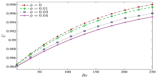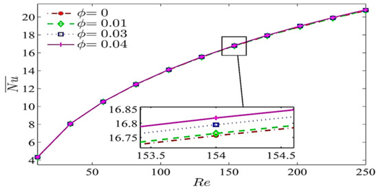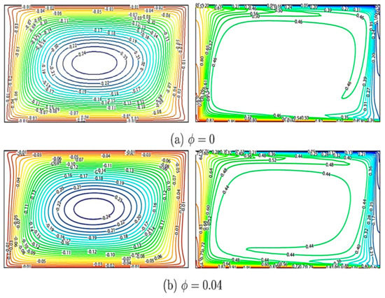 Figure 3 shows that streamlines and isotherms change with respect to volume fraction. The shearing action due to wall movement causes the hybrid nanofluid to rotate in the clockwise direction. As shown from the isothermal lines, by increasing the volume fraction of the hybrid nanofluid, the fluid temperature increases. The temperature gradient increases the thermophoresis near the left and bottom walls. As the distribution of the volume fraction generated in this region changes and the Brownian motion increases, the nanoparticles accumulate near the left and bottom walls, and their migrations towards these two walls often occur. However, the Nusselt number increases as the volume fraction increases. Meanwhile, the streamline variation increases as the nanoparticle volume fraction increases. The particle–fluid interaction is significant in affecting the performance of convective heat transfer of hybrid nanofluid.