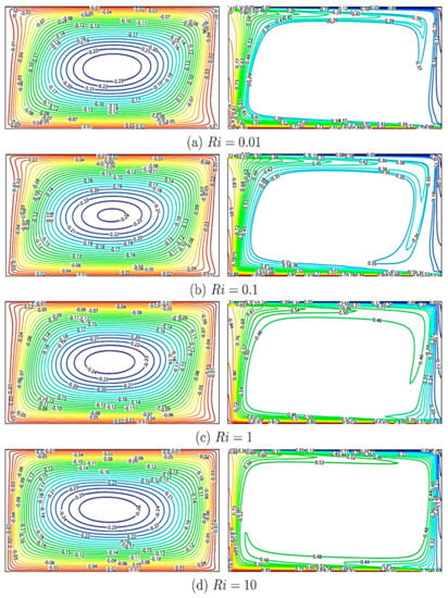 Figure 4 shows the impacts of streamlines and isotherms on the Richardson number. Due to the movement of horizontal walls, the Richardson number Ri increases from 0.01 to 10. The can also be formulated by combining Grashof number () and Reynolds number in order to determine the dominance disparity between normal and forced convection modes. Rising in implies an increase in Gr (buoyancy-dominated). Streamlines near the upper-left and lower-left corners tend to curve towards the adjacent angle and some disturbances are thus generated. These disturbances impute to the domination of mechanical friction caused by wall movement (, forced convection). For the streamlines swirl along a clockwise rotational path. In Figure 4, for Ri = 0.01, isotherms are clustered near the flow-disturbance regions, i.e., the upper-left and the lower-right corners. For convection mode ( = 0.1, 1), the flow becomes slightly non-isothemal as shown in Figure 4. On the other hand, for = 10 where the natural convection dominates, the central isothermal zone expands and fills up a larger portion of the cavity. Moreover, the temperature gradient near the top and bottom walls becomes very high. However, when increases, heat transfer increases and consequently, the effect of Brownian motion fades.