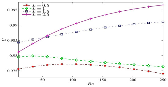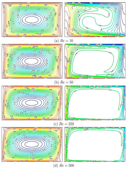 The impact of Reynolds number on the streamlines and isotherms due to wall movement is shown in Figure 5. Here, ranges from 10 to 500 toǴ. As increases, isothermal lines become vertical due to fluid movement. The swirling is more pronounced as increases, resulting in more nanoparticle migration. It is worth mentioning that an increment in would improve the heat transfer rate.