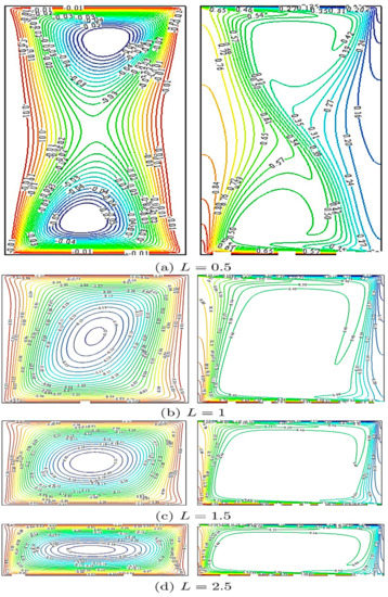 The effect of length (L) on the streamlines and isotherms are shown in Figure 7. It can be seen that the temperature gradient near the bottom wall generally decreases with the increase of length (L). By examining the shapes of the streamlines, increasing the length (L) would decreases the heat transfer rate. Figure 8 shows the local Nusselt number distribution along the hot bottom wall for several values. As L rises, the local Nusselt number declines. Refering to Figure 9, it is clear that the velocity increases with respect to L. Figure 10 shows the local Nusselt number distribution along the hot wall for several values. When increases, the local Nusselt number increases. As shown in Figure 11, the velocity decreases with respect to . The increase of hybrid nanofluid viscosity will suppress its motion apparently.