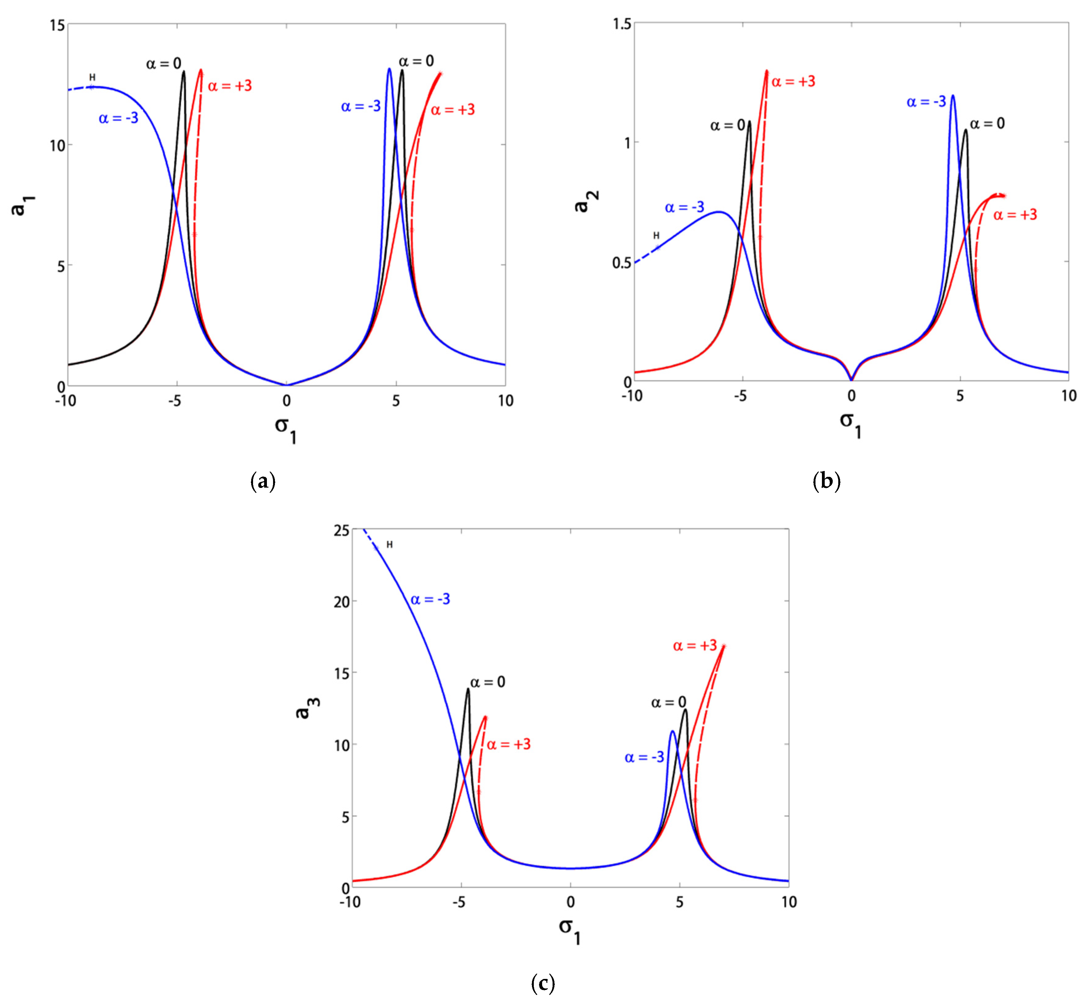 - The controller nonlinearity parameter α should stay in the range of α ∈ (−3, 3), either for hardening or softening effects in the response curves without creating new jumps;