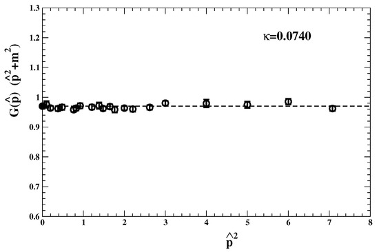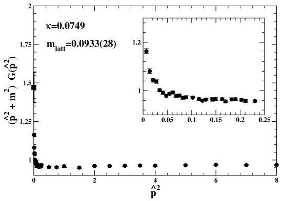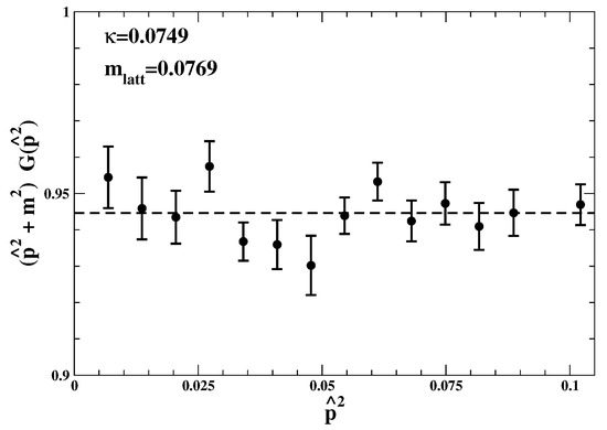 in terms of the lattice squared momentum with . The quality of this fit was then studied to understand how reliable the determination is from the higher-momentum region. Finally, the propagator data were re-scaled by the factor . In this way, deviations from a straight line will show up clearly if a fitted mass fails to describe the lattice data when .