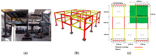 Building mock-up and its reference structure. (a) Lateral view of the mock-up (Moment Resisting Frames-Reduced Beam Section—MRF-RBS); (b) 3-D view of the reference structural scheme; and (c) Plan view and individuation of the tested frame.