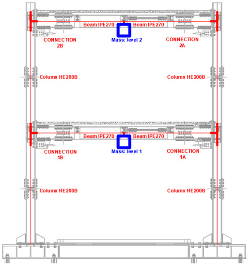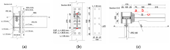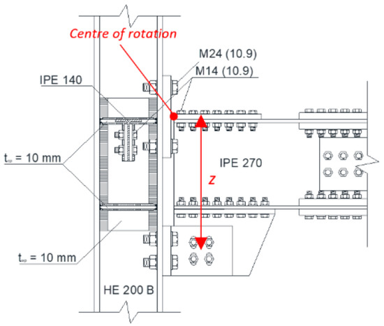It is important to highlight that the bending moment acting at the column flange is lower than the beam plastic resistance (). Starting from the knowledge of the previously defined actions, all the other elements of the connections have been properly designed according to the component method [20,21] (Figure 2).