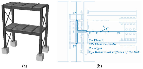 Furthermore, a 3D numerical model of the structure (Figure 4a) was carried out thanks to the software SeismoStruct [48], modelling the structural members with inelastic force-based elements and concentrating the expected active plastic sources at the beam ends. In particular, the hysteretic behavior of the connections has been defined thanks to the smooth link element located at the centerline of the reduced section of the applied connection typology. Instead, all the other elements belonging to the joint have been modelled as rigid components for what concerns the parts in the nodal panel, and elastic components for the remaining ones, as depicted in (Figure 4b).