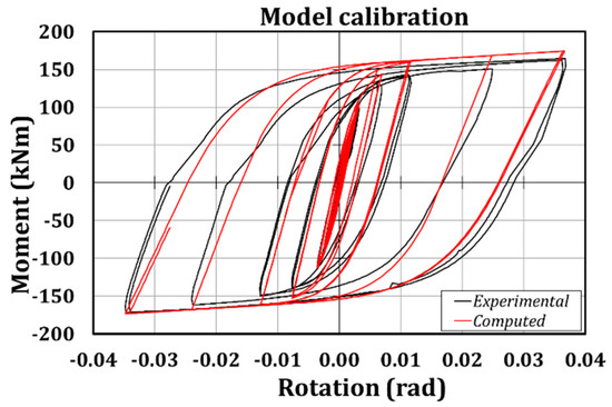 However, since the definition of the parameters which enter the smooth model [49] are 22, and some of them cannot be simply defined referring to the mechanic behavior of the connection, it has been necessary to calibrate these coefficients basing on the results of a cyclic test of a beam-to-column sub-assembly endowed with the same geometric and mechanic properties of the joints mounted to the mock-up (Figure 5). Such a preliminary experimental phase has been followed by the calibration of the needed parameters thanks to the MultiCal software [50], which is based on the adoption of Genetic Algorithms in order to select the best combination of the parameters able to fit the experimental response. In particular, the initial flexural stiffness has been fixed equal to 41,688 kNm2, the positive and negative cracking moments equal to 157 kNm, the positive and negative yield moments equal to 158 kNm, the positive and negative yield curvature equal to 0.096 rad, the positive and negative ultimate curvature equal to 0.193 rad, the positive and negative post-yield flexural stiffness equal to the 0.012% of the elastic corresponding value, the stiffness degrading parameter equal to 4.7, the ductility-based strength decay parameter equal to 0, the smoothness parameter for elastic-yield transition equal to 1.27, the parameter for the shape of unloading equal to 0.50, the slip length parameter equal to 0.07, the parameter for mean moment level of slip equal to 1.36 and finally all the parameter related to the exponent of gap-closing spring, the gap closing curvature and gap closing stiffness equal to 1.