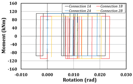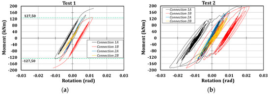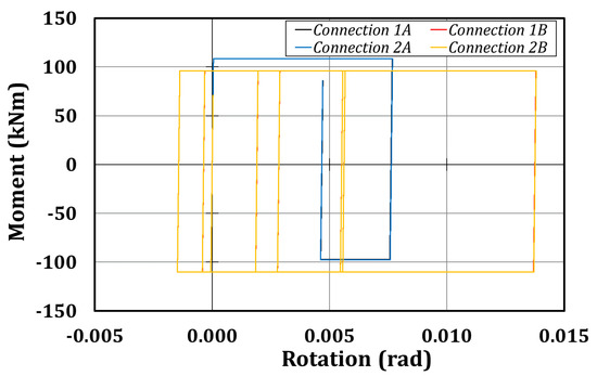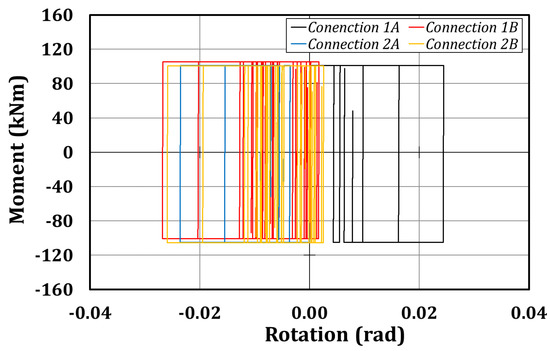 In Table 12 and Table 13, the main numerical results concerning the global and local response of the structure are shown. As it is clear from the tables, the first and the second test should engage the structure in the plastic range. In fact, the expected maximum peak floor displacements are about 130–140 mm, inducing, during the first test, a maximum interstorey drift of 3.4% at the second level, while connection 1A should achieve a maximum rotation of about 25 mrad. Furthermore, the analysis highlights that the friction devices should be activated in all the tests, since the maximum bending moments of about 100 kNm are always reached. The hysteretic curves have the classical rigid-plastic behavior of the friction devices (with the characteristic rectangular shape); it is important to highlight the asymmetric behavior of the connections since the maximum bending moment is about 90 kNm, while the minimum is about 100–110 kNm, depending on the considered test. This is probably due to the axial action arising, due to the force transferred by the actuators to the rigid decks.