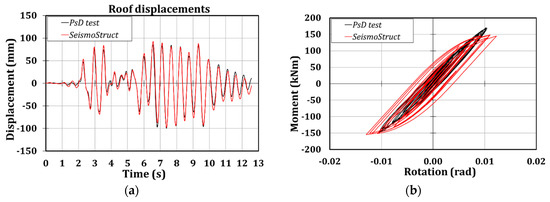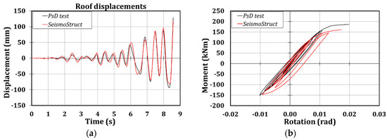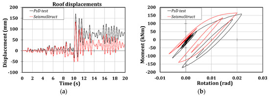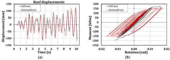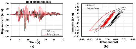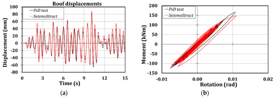 Moreover, it is possible to observe that the numerical model is able to accurately predict the global response of the structure since the scatters in terms of roof displacements between the experimental and numerical outcomes are of about 20% (Figure 8a and Table 5). Instead, the local prediction of the hysteretic behavior of the connection is not correctly foreseen, due to the higher resistance that the connections have exhibited, as it is clear from observing Figure 8b, where the comparison of the moment-rotation curves referred to connection 1B are reported.
