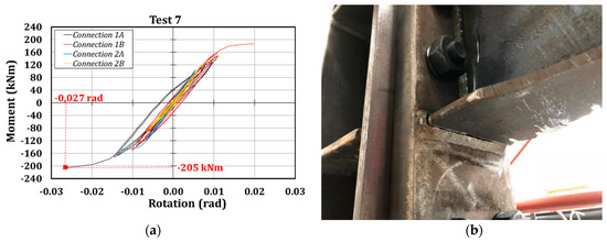 Test 7. (a) Roof displacements; and (b) Moment-rotation curves (connection 1B).
