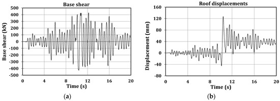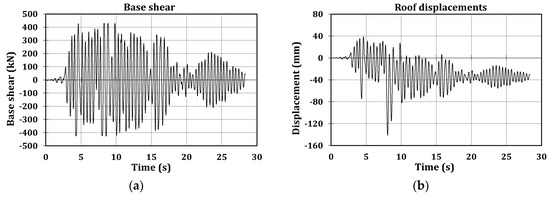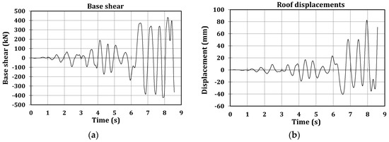 Test 2—Spitak 0.80 g. (a) Base shear; and (b) Roof displacements.