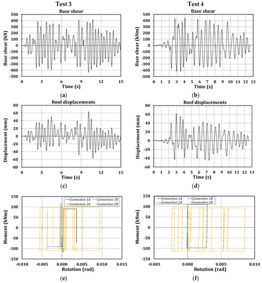 Global and local results of Test 3 (Artificial 0.50 g) and Test 4 (Santa Barbara 0.80 g). (a,b) Base shear; (c,d) Roof displacements; and (e,f) Hysteretic curves.