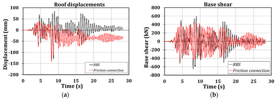 In Table 14, the comparison in terms of floor displacements and base shear are reported: it is possible to observe that the structure equipped with friction connections always exhibits lower base shear actions (in most cases, about 60% and 70% of the corresponding values related to the structure with RBSs) reducing, in such a way the stress distribution in the structural members. This is due to the limited bending moments that the structure equipped with friction devices can transmit to the columns. Instead, this trend cannot be observed referring to the peak floor displacements, which still remain very close to the corresponding values of the structure with RBSs.