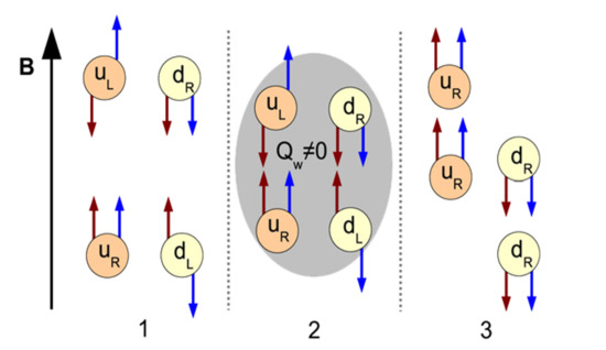 The illustration of the charge separation effect and chiral magnetic effect. The blue arrows and the red arrows respectively denote the spin and the momentum of quarks. (1) At the beginning, the u and d quarks are all in the lowest Landau level and can only move along the direction of the magnetic field. (2) The quarks interact with a nontrivial gauge configuration with . Assuming , this gauge configuration can convert the chiralities of quarks from left-hand to right-hand. It will lead to the chiral imbalance between the left- and right-hand quarks. (3) In the presence of a strong magnetic, the u quarks (or d quark) with different chiralities move in different directions. Due to the chiral imbalance, the total net charge moving along the direction of the magnetic is . In addition, it will result in a charge difference between two domain walls perpendicular to the magnetic field. Reprinted from [28], with permission from Elsevier.