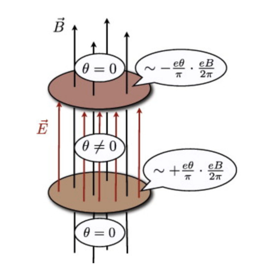 Let us revisit this process in terms of the axion Maxwell Equations (32). As mentioned above, the local chiral imbalanced domains can be regarded as the P-odd bubbles occupied by nontrivial gluon configurations. The angle inside these bubbles is nonzero, but zero outside. We assume that the external magnetic field is uniform and points in a certain direction, so , and there is no external electric field. If the angle is static, , from the second equation of Equation (32), we can immediately obtain that a non-vanishing charge appears on the -domain-walls (see Figure 2) [28,36,43]: