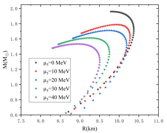 The mass–radius relation of quark star with different chiral chemical potential at and = 90 MeV.