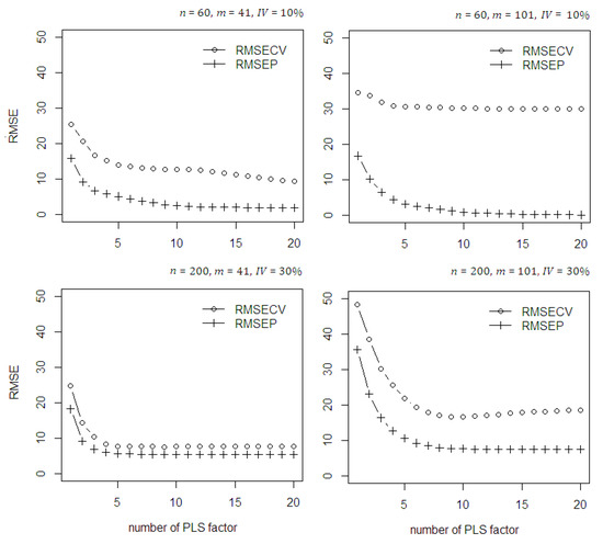 The PLSR model [14] is an iterative procedure of the multivariate statistical method. The method is used to derive original predictor variables that may have a multicollinearity problem into smaller uncorrelated new variables called components. The PLSR constructs a regression model using the new components against its response variable through covariance structure of these two spaces. In chemometric analysis, the PLSR has been widely used for dimensional reduction of high dimensionality problem in the NIR spectral dataset (see [37,38]). In this study, we limited the study only in the case of , where refers to the number of observations, and represents the number of predictor variables.