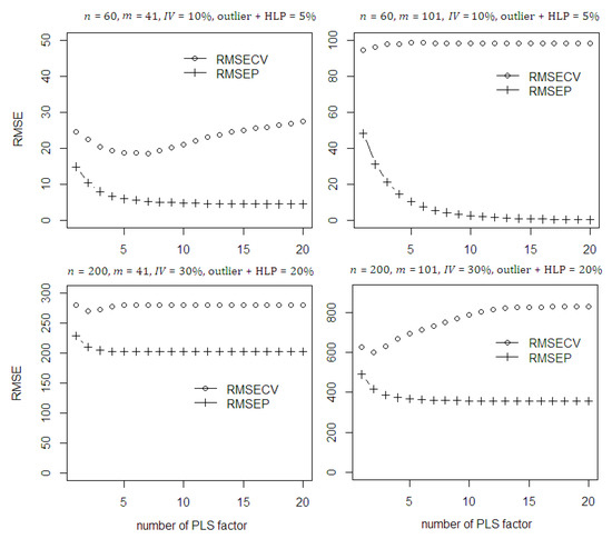 To assess the performance of the methods, several statistical measures such as desirability indices are used: Root Mean Square Error (RMSE), Coefficient of Determination (R2), and Standard Error (SE). The RMSE measures the absolute error of the predicted model; R2 is the proportion of variation in the data summarized by the model and indicates the reliability of the goodness of fit for model; and SE measures the uncertainty in the prediction. Here, the RPD parameter has no more used because it is not different than R2 to classify the model is poor or not [44]. Using the classical PLSR, the RMSECV which is the RMSE obtained through cross-validation, is calculated, along with the increasing number of PLS components. The RMSEP value is the RMSE obtained using the fitted model. In the simulation study, the maximum number of PLS components used was limited up to 20. Some different scenarios were applied to see the stability of classical PLSR model based on sample size, number of predictors, number of important variables, and the contamination of outlier and high leverage points in the dataset. In Figure 1, with no contamination in the data it can be seen that using small sample size ( = 60), small number of predictors ( = 41), and 10% relevant variable ( = 10%) the discrepancy between RMSECV and RMSEP is about two to five times. While using higher number of predictors ( = 101) the discrepancy then become larger. Another scenario using bigger sample size ( = 200), small number of predictors ( = 41), and 30% relevant variable ( = 30%) the discrepancy between RMSECV and RMSEP relatively smaller. While using higher number of predictors ( = 101) the discrepancy increases about two times. This shows that the classical PLS become instable and loss it accuracy when the number of sample size is small and number of predictor higher than sample size. In addition, with less number of relevant variable in the predictor variable also impacts to decrease the model accuracy. Using bigger sample size (for example = 200) as the number of PLS components increases the discrepancy between RMSECV and RMSEP become smaller hence improve the model accuracy and reliability. The rule is the gap between RMSEC and RMSEP values should very small and close to 0. This condition guarantees the reliability of the calibrated model and prevent the model becomes over-under fitting.