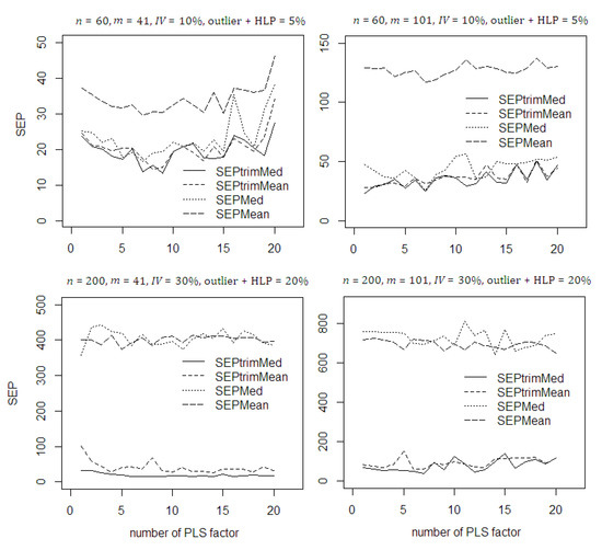 In the proposed RRWA-PLS, the 20% trimmed SEP was used to calculate the weight by removing the 20% highest absolute residual. This procedure is suggested to produce the robust weight instead of using the whole residual. In the calculation of trimmed SEP in each PLS component, using the cross validation procedure the median is preferred. In general, using different dataset scenarios with contamination of outlier and HLP (see Figure 3) the proposed robust trimmed SEP median succeed to remove the influence by removing 20% highest absolute residual. The SEP mean is suffered both with small ( = 60) and bigger ( = 200) sample size due to the contamination. This results in the SEP values of SEP mean becomes two to four times greater than trimmed SEP median. The SEP median lost its advantage when bigger sample size ( = 200) is used. This results in the SEP values of SEP median becomes four times greater than trimmed SEP median. The SEP values using trimmed SEP median is lower than trimmed SEP mean thus improves model accuracy. This proves the robustness of the trimmed SEP median in weight calculation which irrespective of sample size, number of important variables, and percentage of contamination of outlier and HLP in the dataset.