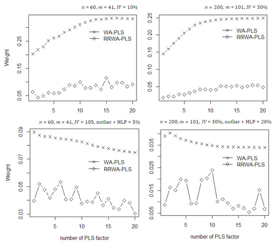 It is very important to compare the weighting schemes between the WA-PLS and RRWA-PLS. This weight provides the contribution of predictors based on the aggregation of the PLS components used in the model. In Figure 4, the mean weights of the methods are also shown to illustrate two conditions: no contamination and with contamination of outlier and high leverage points. For no contamination, the weights in both WA-PLS and RRWA-PLS methods increase as the number of PLS component increases. The weight of RRWA-PLS is relatively smaller than that of the WA-PLS. In cases where the number of PLS components are greater than 10, the weight in both methods are not so much affected by the increasing number of PLS used in the model. On the other hand, when contaminated with outlier and HLP, the weights in both WA-PLS and RRWA-PLS methods decrease as the number of PLS component increases. Based on these scenarios, the WA-PLS still produces higher RMSE than RRWA-PLS. In general, according to the less weight value used in the model, the RRWA-PLS method is still superior and more efficient than the WA-PLS.