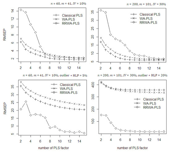 In Figure 5, the prediction accuracy of the methods is evaluated through their RMSEP values. To get a better illustration, the maximum number of PLS components was limited to 15 components. With no contamination of outlier and HLP in the dataset, in the first 6 number of PLS components, the RRWA-PLS is less efficient than the classical PLS and WA-PLS. However, as the number of PLS component increases up to 15, the RRWA-PLS is comparable to the classical PLS and WA-PLS. The proposed RRWA-PLS shows its robustness when the contaminations of outlier and HLP exist in the dataset. It has succeeded to prevent the influence of the outlier and HLP during model fitting. On the other hand, the classical PLS and WA-PLS suffer from the influence of outlier and HLP both in low and high level percentage of contamination, resulting in poor accuracy.
