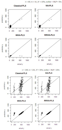 The prediction ability of the methods using the contamination data was evaluated by plotting the predicted values against the actual values (see Figure 6). The classical PLS and WA-PLS suffered from the contamination of outliers and HLP in the dataset, which resulted in a poor prediction. This is because the PLSR estimator is not resistant to the contamination hence, biasing the estimated model. The MWA-PLS and proposed RRWA-PLS are completely free from the impact of outliers and HLP in the dataset. The influential observations are removed far from the fitting line, while good observations are closed to the fitted regression line. The prediction ability in RRWA-PLS is better than the MWA-PLS; the method ensures the best prediction capabilities with better accuracy than the other methods. The RRWA-PLS shows its robustness which is not affected by the inclusion of model with the number of PLS component used and is resistant to the influence of outliers and HLP.
